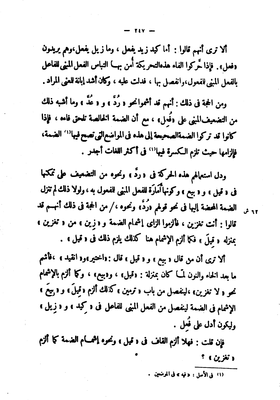 ودل استعمالهم هذه الحركة في «رد» ونحوه من التضعيف على تمكنها في «قيل» و «بيع» وكونها أمارة للفعل المبني للمفعول به، ولولا ذلك لم تنزل الضمة المحضة إليها في نحو قولهم «رد» ونحوه، / من الحجة في ذلك أنهم قد قالوا: أنت تغزين، فألزموا الزاى إشمام الضمة و «زين» من «تغزين» بمنزلة «قيل» فكما ألزم الإشمام هنا كذلك يلزم ذلك في «قيل» .