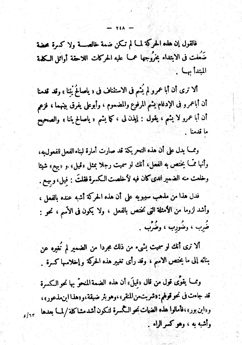 فدل هذا من مذهب سيبويه على أن هذه الحركة أشبه عنده بالفعل، وأشد لزوماً من الأمثلة التي تختص بالفعل، ولا يكون في الاسم، نحو: