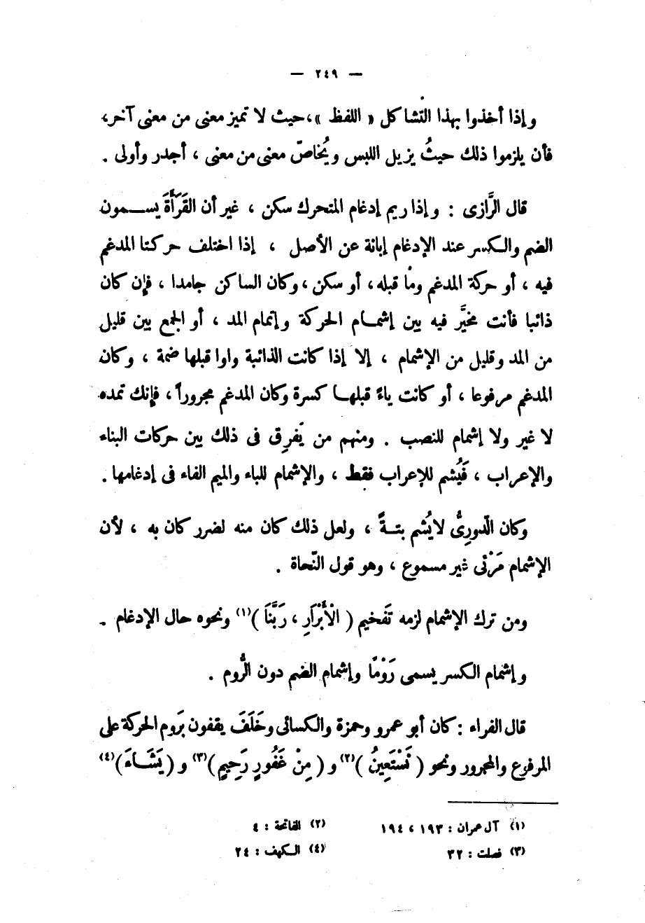 قال الفراء: كان أبو عمرو وحمزة والكسائي وخلف يقفون بروم الحركة على المرفوع والمجرور ونحو (نَسْتَعِينُ) «2» و (مِنْ غَفُورٍ رَحِيمٍ) «3» و (يَشاءُ) «4»