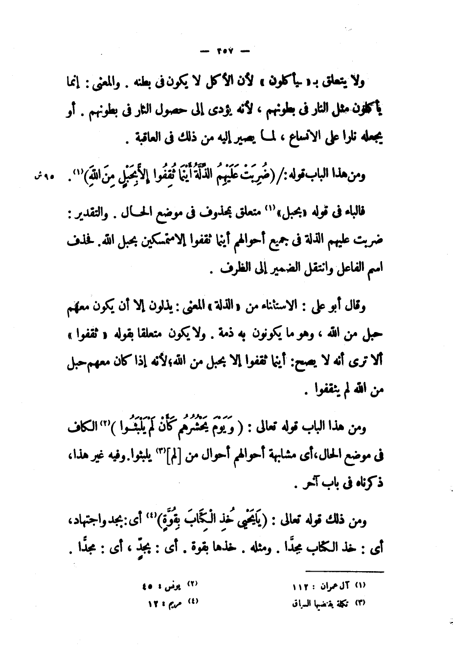 وقال أبو علي: الاستثناء من «الذلة» المعنى: يذلون إلا أن يكون معهم حبل من الله، وهو ما يكونون به ذمة. ولا يكون متعلقا بقوله «ثقفوا» ألا ترى أنه لا يصح: أينما ثقفوا إلا بحبل من الله لأنه إذا كان معهم حبل من الله لم يثقفوا.