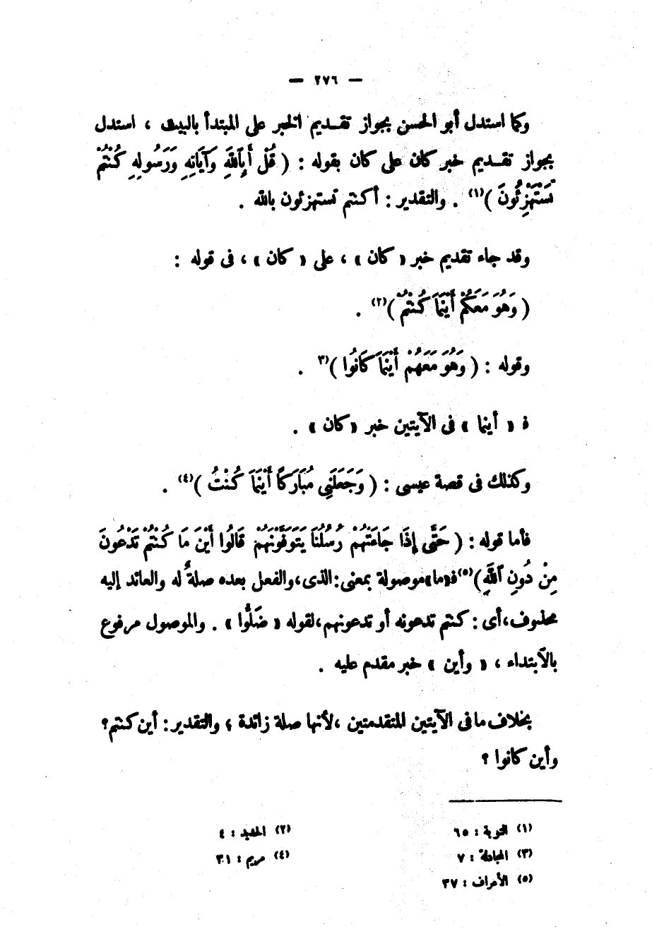 وكما استدل أبو الحسن بجواز تقديم الخبر على المبتدأ بالبيت، استدل بجواز تقديم خبر كان على كان بقوله: (قُلْ أَبِاللَّهِ وَآياتِهِ وَرَسُولِهِ كُنْتُمْ تَسْتَهْزِؤُنَ) «1» . والتقدير: أكنتم تستهزئون بالله.