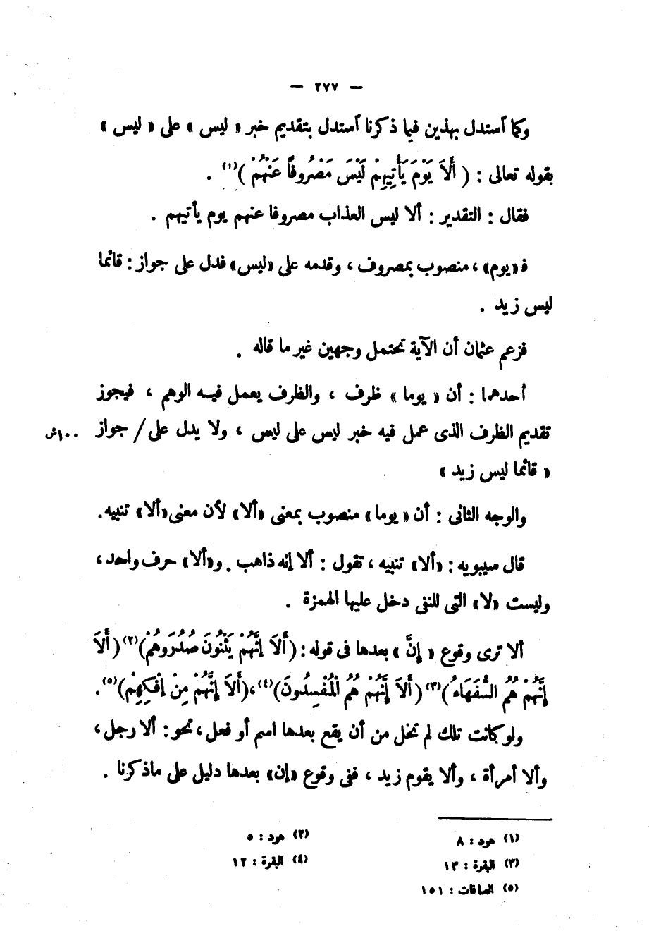 وكما استدل بهذين فيما ذكرنا استدل بتقديم خبر «ليس» على «ليس» بقوله تعالى: (أَلا يَوْمَ يَأْتِيهِمْ لَيْسَ مَصْرُوفاً عَنْهُمْ) «1» .