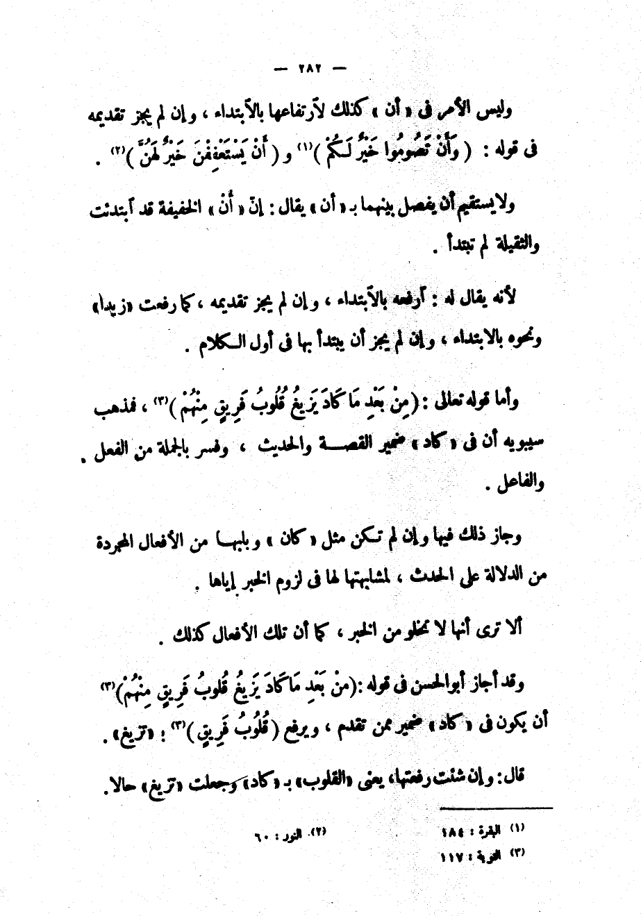 وأما قوله تعالى: (مِنْ بَعْدِ ما كادَ يَزِيغُ قُلُوبُ فَرِيقٍ مِنْهُمْ) «3» ، فمذهب سيبويه أن في «كاد» ضمير القصة والحديث، وفسر بالجملة من الفعل والفاعل.