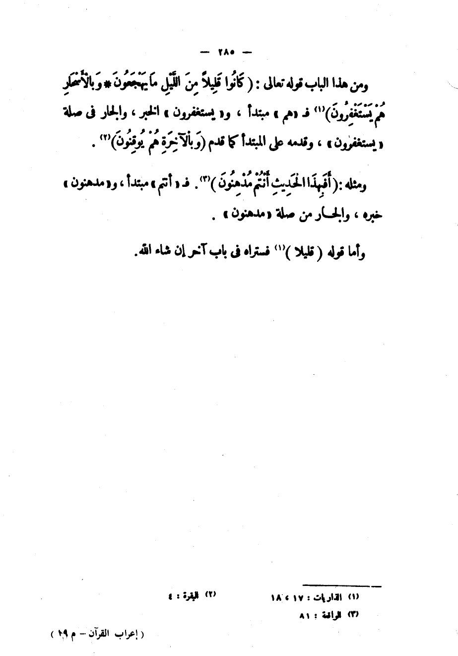 ومن هذا الباب قوله تعالى: (كانُوا قَلِيلًا مِنَ اللَّيْلِ ما يَهْجَعُونَ (17) وَبِالْأَسْحارِ هُمْ يَسْتَغْفِرُونَ) «1» ف «هم» مبتدأ، و «يستغفرون» الخبر، والجار في صلة «يستغفرون» ، وقدمه على المبتدأ كما قدم (وَبِالْآخِرَةِ هُمْ يُوقِنُونَ) «2» .