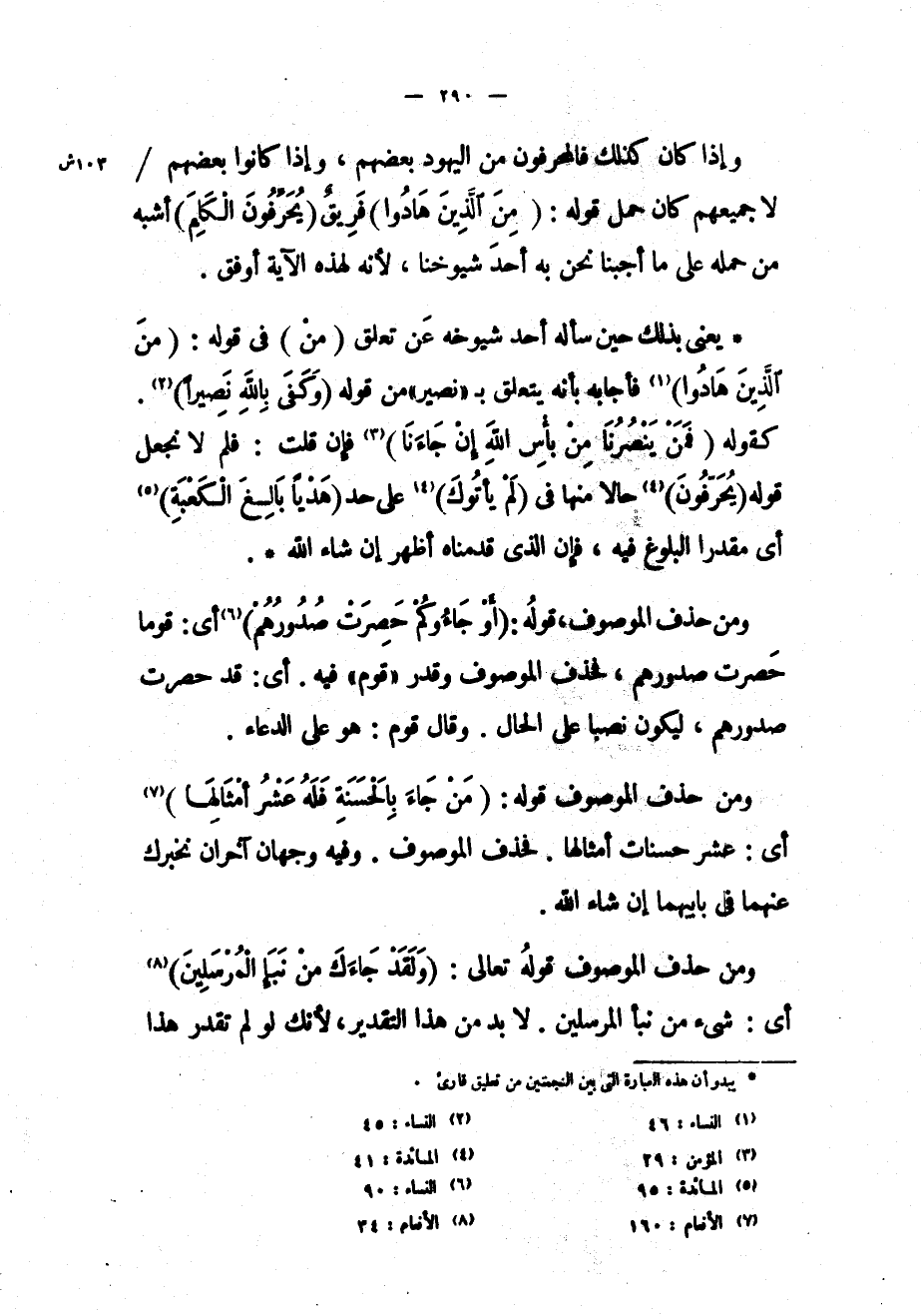 ومن حذف الموصوف قوله تعالى: (وَلَقَدْ جاءَكَ مِنْ نَبَإِ الْمُرْسَلِينَ) «10» أي: شيء من نبأ المرسلين. لا بد من هذا التقدير، لأنك لو لم تقدر هذا