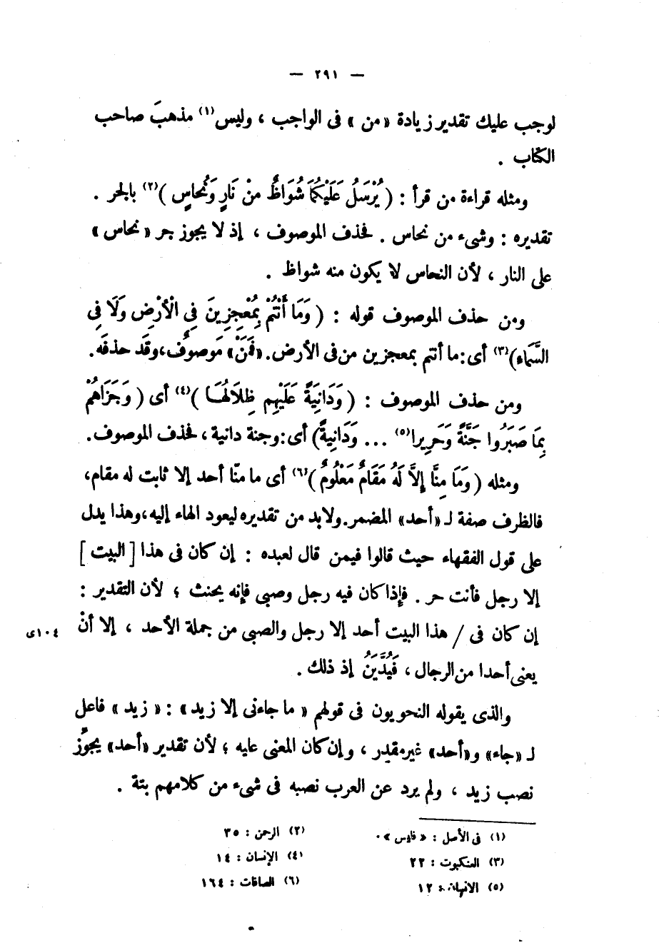 ومن حذف الموصوف قوله: (وَما أَنْتُمْ بِمُعْجِزِينَ فِي الْأَرْضِ وَلا فِي السَّماءِ) «3» أي: ما أنتم بمعجزين من في الأرض. «فمن» موصوف، وقد حذفه.