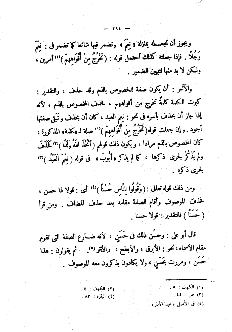 كبرت الكلمة كلمةً تخرج من أفواههم، فحذف المخصوص بالذم، لأنه إذا جاز أن يحذف بأسره في نحو: نعم العبد، كان أن يحذف وتبقى صفتها أجود. وإن جعلت قوله (تَخْرُجُ مِنْ أَفْواهِهِمْ) «2» صلة ل «كلمة» المذكورة، كان المخصوص بالذم مرادا، ويكون ذلك قولهم (اتَّخَذَ اللَّهُ وَلَداً) «3» فحذف ولم يذكر لجرى ذكرها، كما لم يذكر «أيُّوب» في قوله (نِعْمَ الْعَبْدُ) «4» لجرى ذكره.