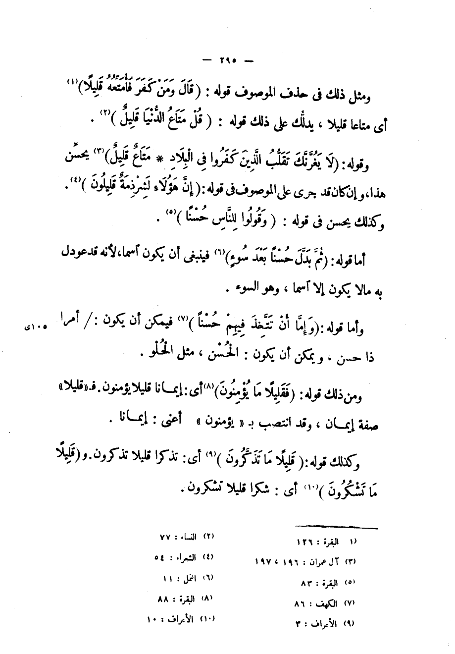 ومثل ذلك في حذف الموصوف قوله: (قالَ وَمَنْ كَفَرَ فَأُمَتِّعُهُ قَلِيلًا) «1» أي متاعاً قليلاً، يدلك على ذلك قوله: (قُلْ مَتاعُ الدُّنْيا قَلِيلٌ) «2» .