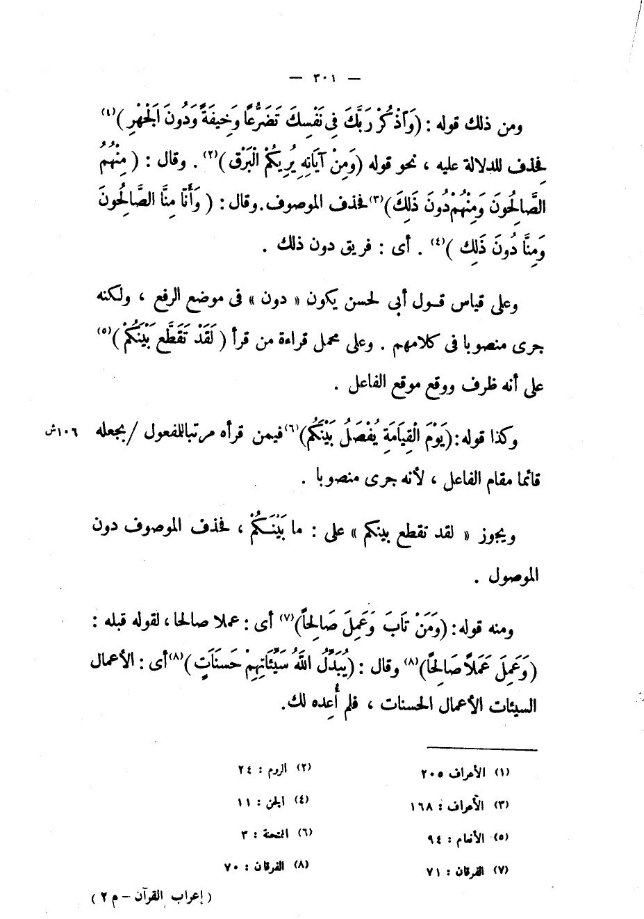 ومن ذلك قوله: (وَاذْكُرْ رَبَّكَ فِي نَفْسِكَ تَضَرُّعاً وَخِيفَةً وَدُونَ الْجَهْرِ) «1» فحذف للدلالة عليه نحو قوله (وَمِنْ آياتِهِ يُرِيكُمُ الْبَرْقَ) «2» . وقال: (مِنْهُمُ الصَّالِحُونَ وَمِنْهُمْ دُونَ ذلِكَ) «3» فحذف الموصوف. وقال: (وَأَنَّا مِنَّا الصَّالِحُونَ وَمِنَّا دُونَ ذلِكَ) «4» . أي: فريق دون ذلك.