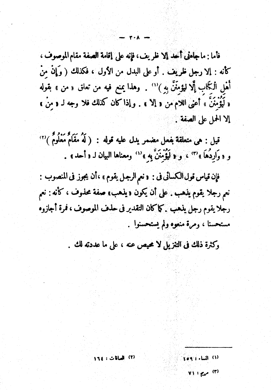 فأما: ما جاءني أحد إلا ظريف، فإنه على إقامة الصفة مقام الموصوف، كأنه: إلا رجل ظريف. أو على البدل من الأول، فكذلك (وَإِنْ مِنْ أَهْلِ الْكِتابِ إِلَّا لَيُؤْمِنَنَّ بِهِ) «1» . وهذا يمنع فيه من تعلق «من» بقوله «ليؤمنن» أعني اللام من «إلا» . وإذا كان كذلك فلا وجه ل «مِنْ» إلا الحمل على الصفة.