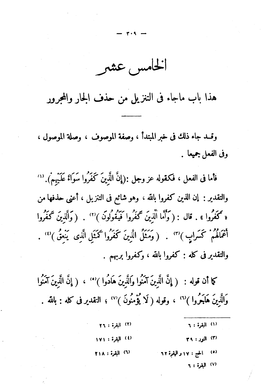 هذا باب ما جاء في التنزيل من حذف الجار والمجرور وقد جاء ذلك في خبر المبتدأ، وصفة الموصوف، وصلة الموصول، وفي الفعل جميعاً.