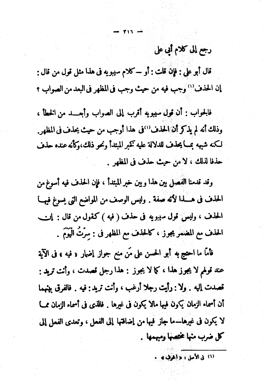 فالجواب: أن قول سيبويه أقرب إلى الصواب وأبعد من الخطأ، وذلك أنه لم يذكر أن الحذف «2» في هذا أوجب من حيث يحذف في المظهر.
