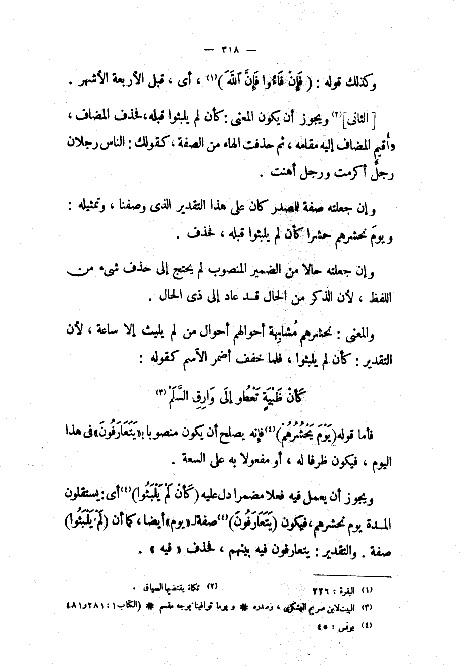 ويجوز أن يعمل فيه فعلاً مضمراً دل عليه (كَأَنْ لَمْ يَلْبَثُوا) «5» أي: يستقلون المدة يوم نحشرهم، فيكون (يَتَعارَفُونَ) «6» صفة ل «يوم» أيضاً، كما أن (لَمْ يَلْبَثُوا) صفة. والتقدير: يتعارفون فيه بينهم، فحذف «فيه» ..