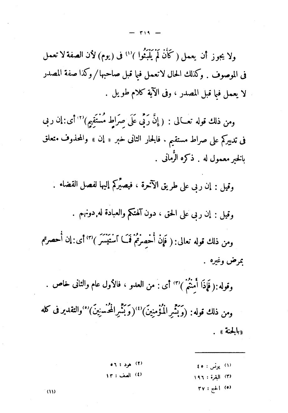 ومن ذلك قوله تعالى: (إِنَّ رَبِّي عَلى صِراطٍ مُسْتَقِيمٍ) «2» أي: إن ربي في تدبيركم على صراط مستقيم. فالجار الثاني خبر «إن» والمحذوف متعلق بالخبر معمول له. ذكره الرماني.