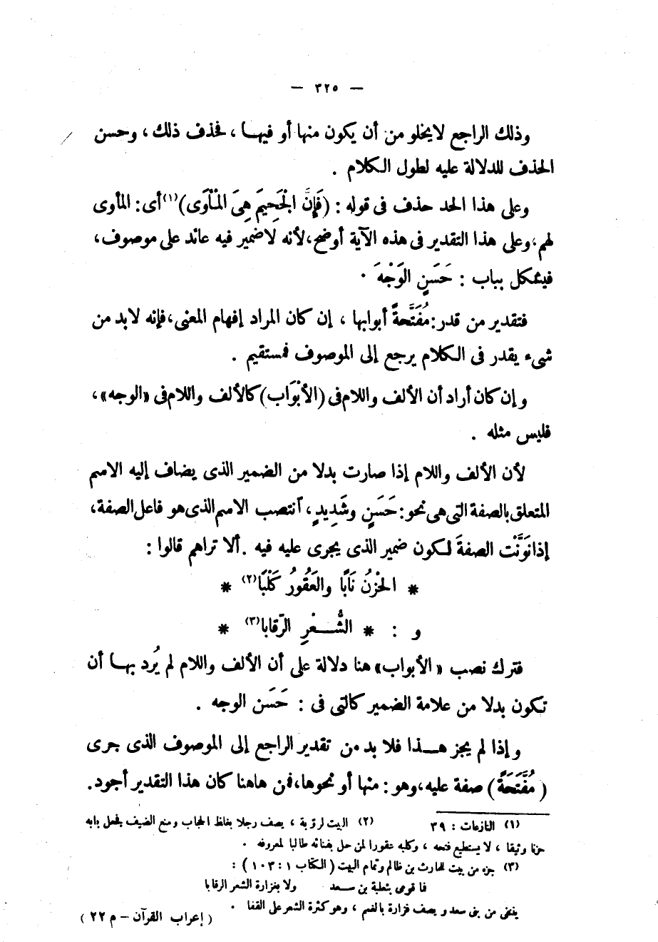 وعلى هذا الحد حذف في قوله: (فَإِنَّ الْجَحِيمَ هِيَ الْمَأْوى) «1» أي: المأوى لهم وعلى هذا التقدير في هذه الآية أوضح، لأنه لا ضمير فيه عائد على موصوف، فيشكل بباب: حسن الوجه.