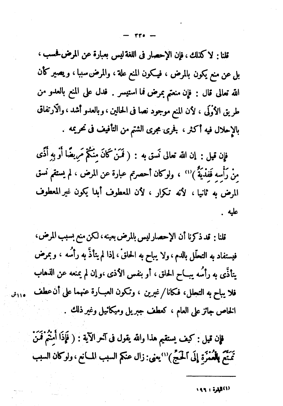 قلنا: لا كذلك، فإن الإحصار في اللغة ليس بعبارة عن المرض فحسب، بل عن منع يكون بالمرض، فيكون المنع علة، والمرض سبباً، ويصير كأن الله تعالى قال: فإن منعتم بمرض فما استيسر. فدل على المنع بالعدو من طريق الأولى، لأن المنع موجود نصاً في الحالين، وبالعدو أشد، والارتفاق بالإحلال فيه أكثر، فجرى مجرى الشتم من التأفيف في تحريمه.