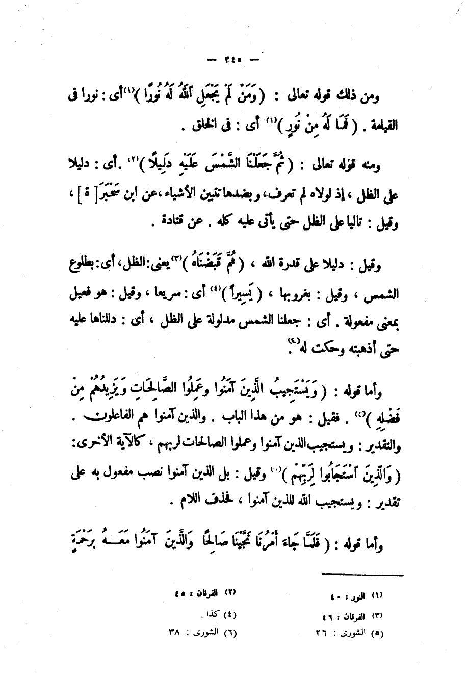 ومن ذلك قوله تعالى: (وَمَنْ لَمْ يَجْعَلِ اللَّهُ لَهُ نُوراً) «1» أي: نوراً في القيامة. (فَما لَهُ مِنْ نُورٍ) «2» أي: في الخلق.