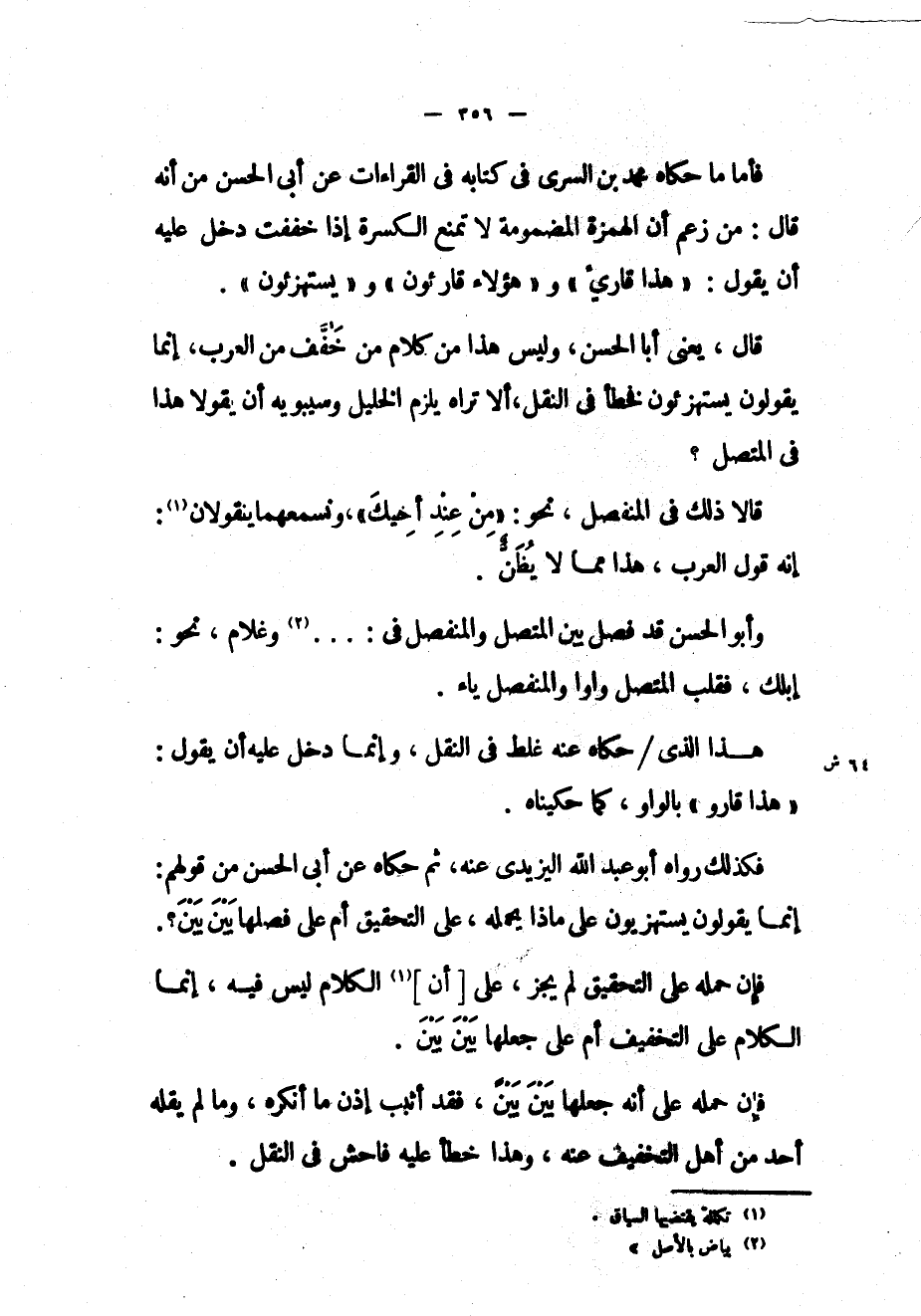 فأما ما حكاه محمد بن السري في كتابه في القراءات عن أبي الحسن من أنه قال: من زعم أن الهمزة المضمومة لا تمنع الكسرة إذا خففت دخل عليه أن يقول: «هذا قارئ» و «هؤلاء قارئون» و «يستهزئون» .