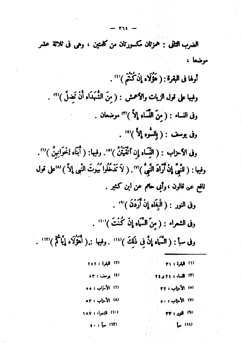 الضرب الثاني: همزتان مكسورتان من كلمتين، وهي في ثلاثة عشر موضعاً، أولها في البقرة: (هؤُلاءِ إِنْ كُنْتُمْ) «1» .