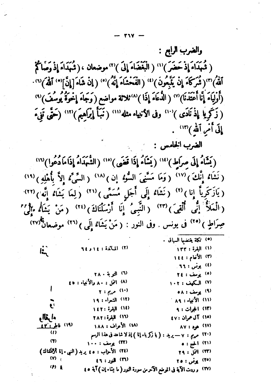 (يَشاءُ إِلى صِراطٍ) «15» (يَشاءُ إِذا قَضى) «16» (الشُّهَداءُ إِذا ما دُعُوا) «17» (نَشؤُا إِنَّكَ) «18» (وَما مَسَّنِيَ السُّوءُ إِنْ) «19» (السَّيِّئُ إِلَّا بِأَهْلِهِ) «20» (يا زَكَرِيَّا إِنَّا) «21» (نَشاءُ إِلى أَجَلٍ مُسَمًّى) «22» (لِما يَشاءُ إِنَّهُ) «23» (الْمَلَأُ إِنِّي أُلْقِيَ) «24» (النَّبِيُّ إِنَّا أَرْسَلْناكَ) «25» (مَنْ يَشاءُ إِلى صِراطٍ) «26» في يونس. وفي النور: (مَنْ يَشاءُ إِلى) «27» موضعان «28»