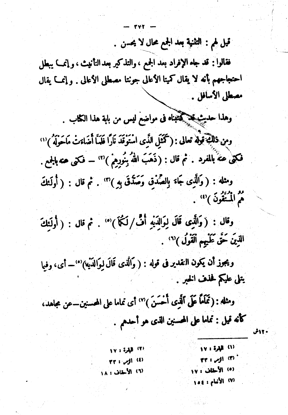 ومن ذلك قوله تعالى: (كَمَثَلِ الَّذِي اسْتَوْقَدَ ناراً فَلَمَّا أَضاءَتْ ما حَوْلَهُ) «1» فكنى عنه بالمفرد. ثم قال: (ذَهَبَ اللَّهُ بِنُورِهِمْ) «2» - فكنى عنه بالجمع.