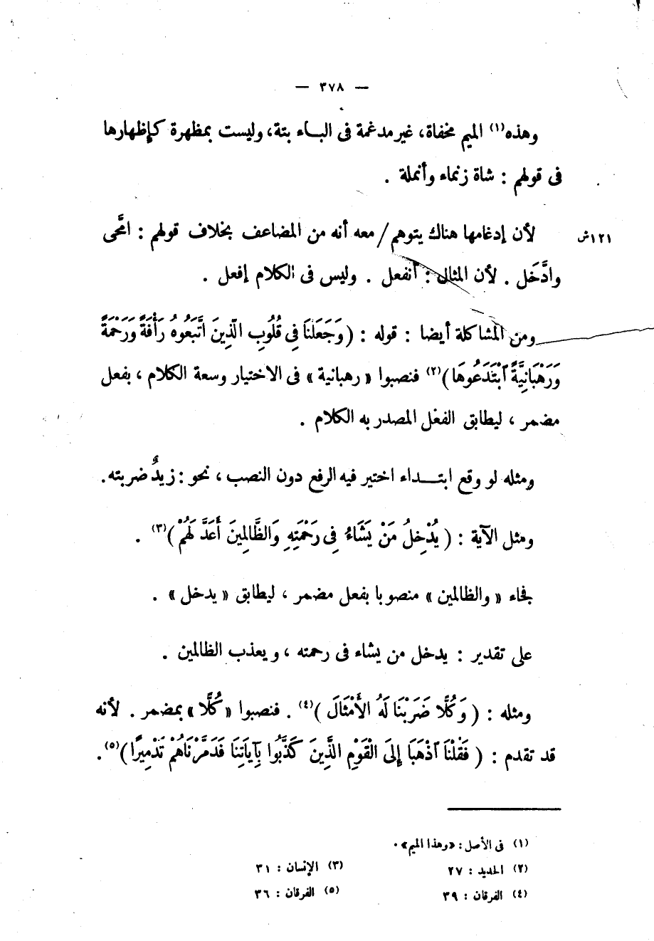 ومثله: قوله: (أَنْبَأَهُمْ) «5» (فَانْبَجَسَتْ) «6» (وَإِنْ يَكُ) «7» أبدلوا من النون ميماً، لأن الميم يوافق الباء في المخرج، وتوافق النون في الغنة.