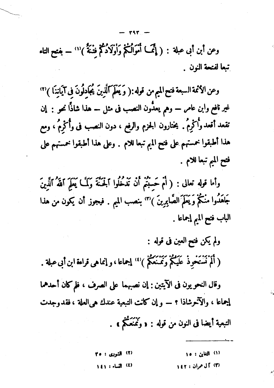 وأما قوله تعالى: (أَمْ حَسِبْتُمْ أَنْ تَدْخُلُوا الْجَنَّةَ وَلَمَّا يَعْلَمِ اللَّهُ الَّذِينَ جاهَدُوا مِنْكُمْ وَيَعْلَمَ الصَّابِرِينَ) «3» بنصب الميم. فيجوز أن يكون من هذا الباب فتح الميم إجماعاً.