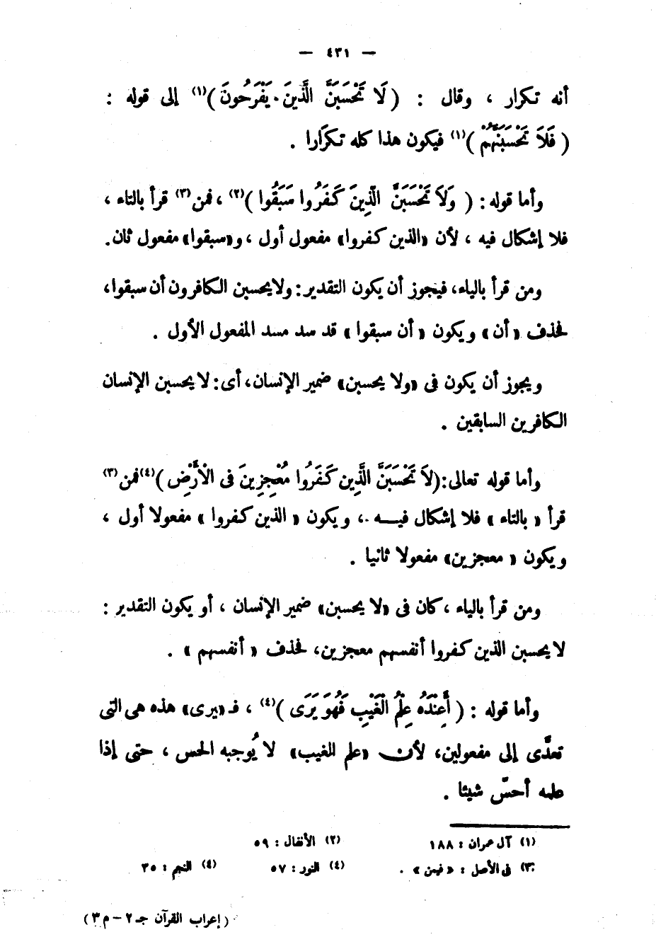 وأما قوله تعالى: (لا تَحْسَبَنَّ الَّذِينَ كَفَرُوا مُعْجِزِينَ فِي الْأَرْضِ) «5» فمن «6» قرأ «بالتاء» فلا إشكال فيه.، ويكون «الذين كفروا» مفعولاً أول، ويكون «معجزين» مفعولاً ثانياً.