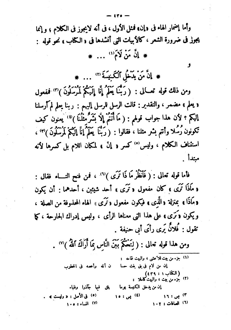 ومن ذلك قوله تعالى: (رَبُّنا يَعْلَمُ إِنَّا إِلَيْكُمْ لَمُرْسَلُونَ) «3» فمفعول «يعلم» مضمر، والتقدير: قالت الرسل للمرسل إليهم: ربنا يعلم لم أرسلنا إليكم؟ لأن هذا جواب قولهم: (ما أَنْتُمْ إِلَّا بَشَرٌ مِثْلُنا) «4» يعنون كيف تكونون رسلاً وأنتم بشر مثلنا، فقالوا: (رَبُّنا يَعْلَمُ إِنَّا إِلَيْكُمْ لَمُرْسَلُونَ) «5» ، استئناف الكلام، وليس «6» كسر «إن» لمكان اللام بل كسرها لأنه مبتدأ.