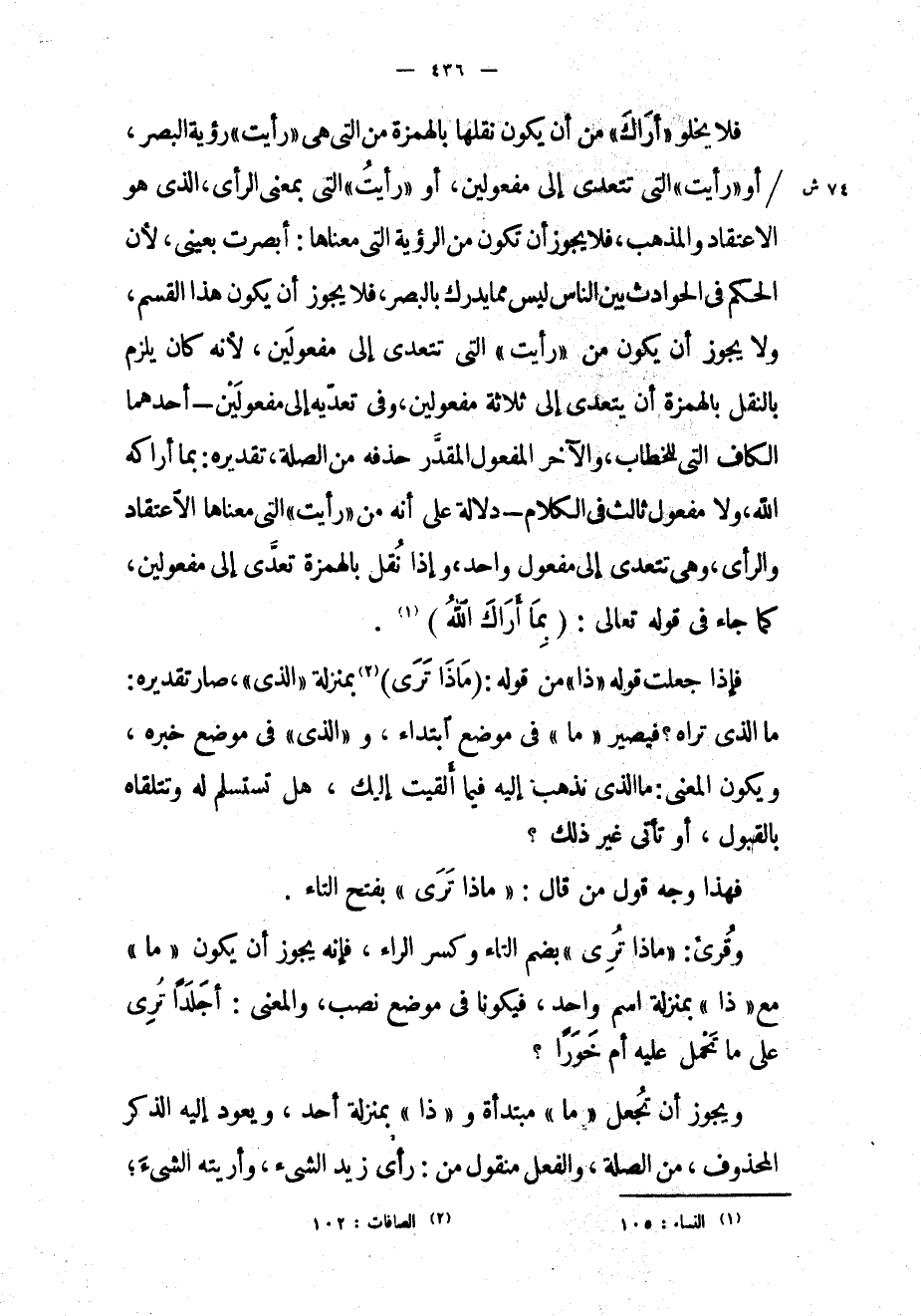 ما الذي تراه؟ فيصير «ما» فى موضع ابتداء، و «الذي» في موضع خبره، ويكون المعنى: ما الذي نذهب إليه فيما ألقيت إليك، هل تستسلم له وتتلقاه بالقبول، أو تأتي غير ذلك؟