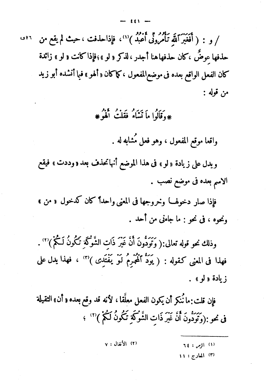 / و: (أَفَغَيْرَ اللَّهِ تَأْمُرُونِّي أَعْبُدُ) «1» ، فإذا حذفت، حيث لم يقع من حذفها عوض، كان حذفها هنا أجدر، لذكر «لو» فإذا كانت «لو» زائدة كان الفعل الواقع بعده في موضع المفعول، كما كان «ألهو» فيما أنشده أبو زيد من قوله: