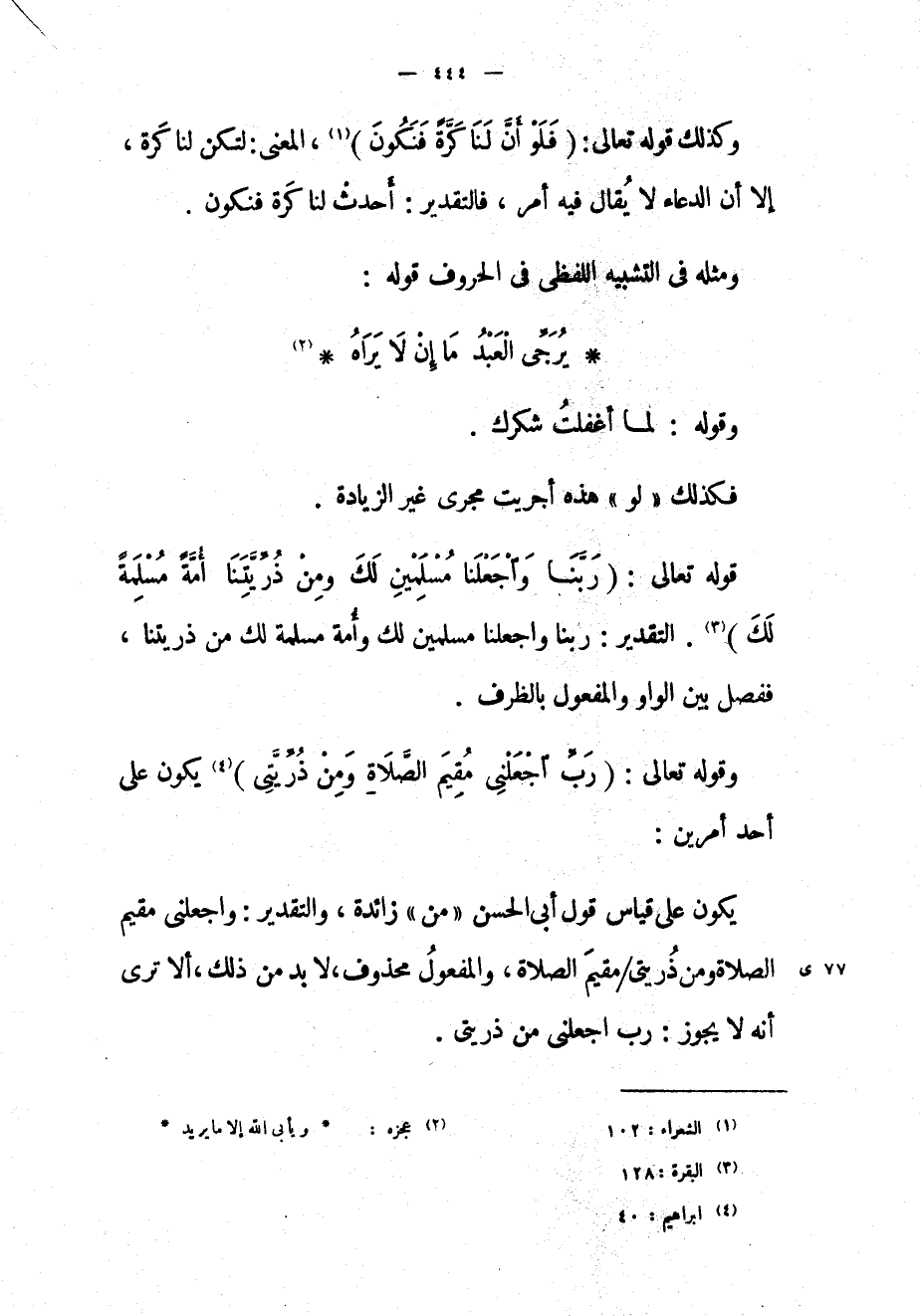 قوله تعالى: (رَبَّنا وَاجْعَلْنا مُسْلِمَيْنِ لَكَ وَمِنْ ذُرِّيَّتِنا أُمَّةً مُسْلِمَةً لَكَ) «3» . التقدير: ربنا واجعلنا مسلمين لك وأمة مسلمة لك من ذريتنا، ففصل بين الواو والمفعول بالظرف.