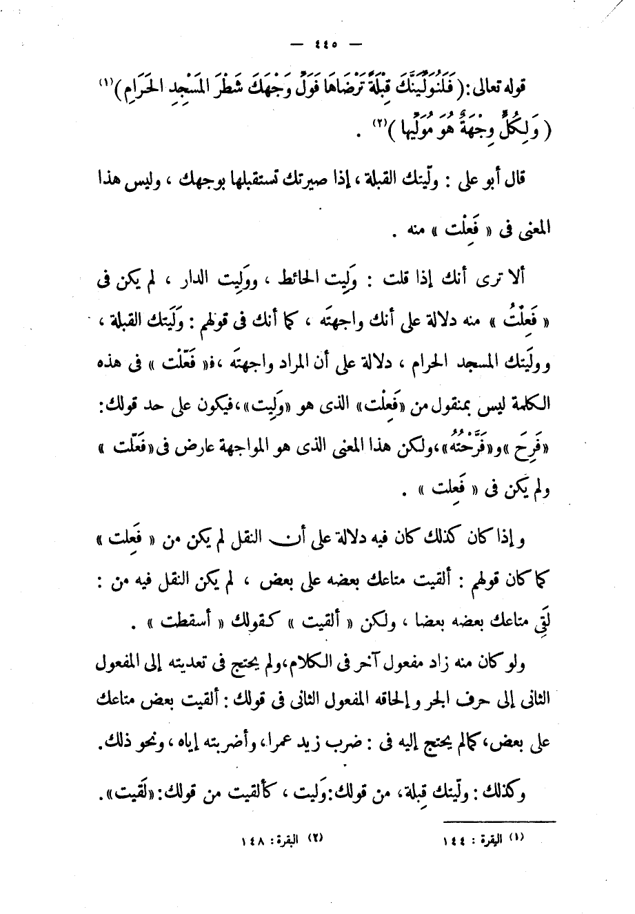 ألا ترى أنك إذا قلت: وليت الحائط، ووليت الدار، لم يكن في «فعلت» منه دلالة على أنك واجهته، كما أنك في قولهم: وليتك القبلة، ووليتك المسجد الحرام، دلالة على أن المراد واجهته، ف «فعلت» في هذه الكلمة ليس بمنقول من «فعلت» الذي هو «وليت» ، فيكون على حد قولك: