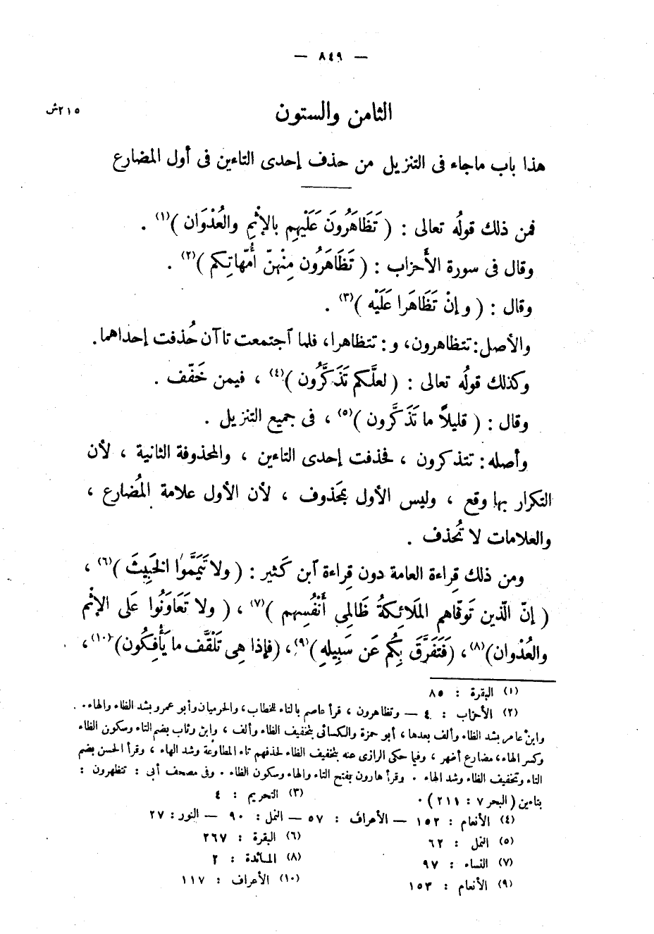 هذا باب ما جاء في التنزيل من حذف إحدى التاءين في أول المضارع فمن ذلك قوله تعالى: (تَظاهَرُونَ عَلَيْهِمْ بِالْإِثْمِ وَالْعُدْوانِ) «1» .
