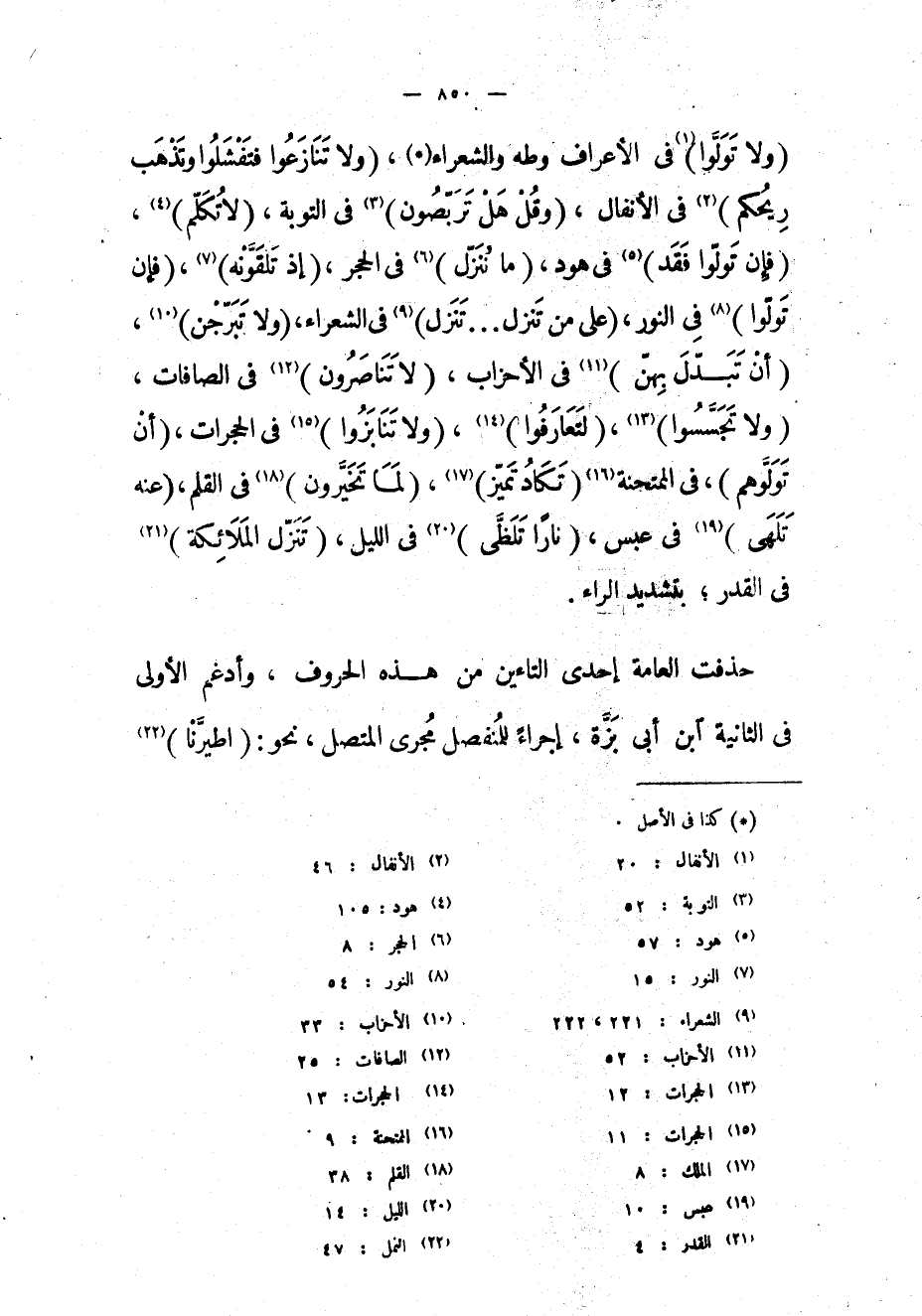 (وَلا تَوَلَّوْا) «1» في الأعراف وطه والشعراء «2» ، (وَلا تَنازَعُوا فَتَفْشَلُوا وَتَذْهَبَ رِيحُكُمْ) «3» فى الأنفال، (قُلْ هَلْ تَرَبَّصُونَ) «4» في التوبة، (لا تَكَلَّمُ) «5» ، (فَإِنْ تَوَلَّوْا فَقَدْ) «6» في هود، (ما نُنَزِّلُ) «7» في الحجر، (إِذْ تَلَقَّوْنَهُ) «8» ، (فَإِنْ تَوَلَّوْا) «9» في النور، (عَلى مَنْ تَنَزَّلُ ... تَنَزَّلُ) «10» في الشعراء، (وَلا تَبَرَّجْنَ) «11» ، (أَنْ تَبَدَّلَ بِهِنَّ) «12» في الأحزاب، (لا تَناصَرُونَ) «13» في الصافات، (وَلا تَجَسَّسُوا) «14» ، (لِتَعارَفُوا) «15» ، (وَلا تَنابَزُوا) «16» في الحجرات، (أَنْ تَوَلَّوْهُمْ) ، في الممتحنة «17» (تَكادُ تَمَيَّزُ) «18» ، (لَما تَخَيَّرُونَ) «19» في القلم، (عَنْهُ تَلَهَّى) «20» في عبس، (ناراً تَلَظَّى) «21» في الليل، (تَنَزَّلُ الْمَلائِكَةُ) «22» في القدر بتشديد الراء.