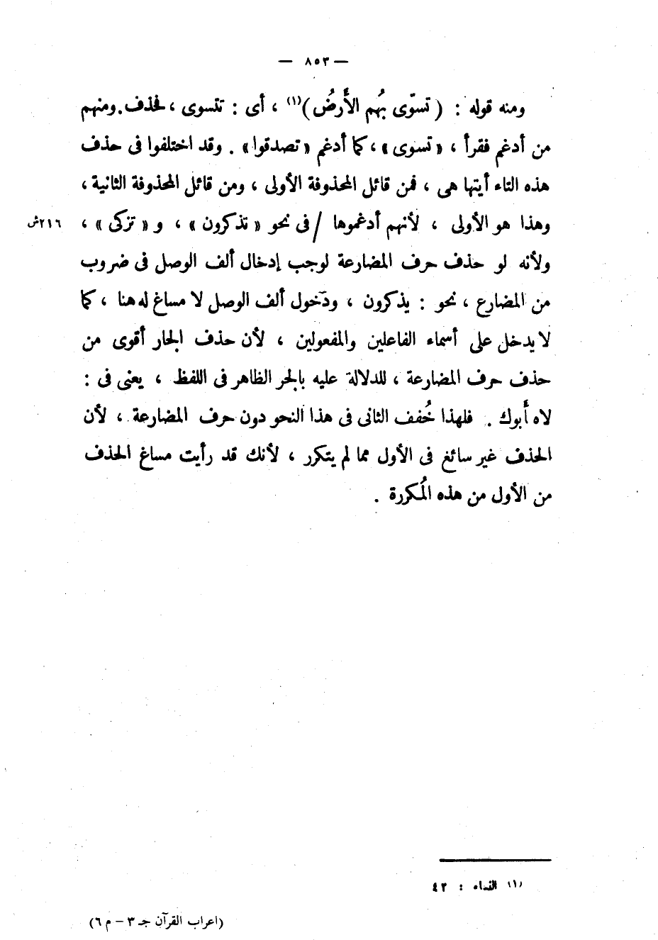 ومنه قوله: (تُسَوَّى بِهِمُ الْأَرْضُ) «1» ، أي: تتسوى، فحذف. ومنهم من أدغم فقرأ، «تسوى» ، كما أدغم «تصدقوا» . وقد اختلفوا في حذف هذه التاء أيتها هي، فمن قائل المحذوفة الأولى، ومن قائل المحذوفة الثانية، وهذا هو الأولى، لأنهم أدغموها/ فى نحو «تذكرون» ، و «تزكى» ، ولأنه لو حذف حرف المضارعة لوجب إدخال ألف الوصل في ضروب من المضارع، نحو: يذكرون، ودخول ألف الوصل لا مساغ له هنا، كما لا يدخل على أسماء الفاعلين والمفعولين، لأن حذف الجار أقوى من حذف حرف المضارعة، للدلالة عليه بالجر الظاهر في اللفظ، يعني في: