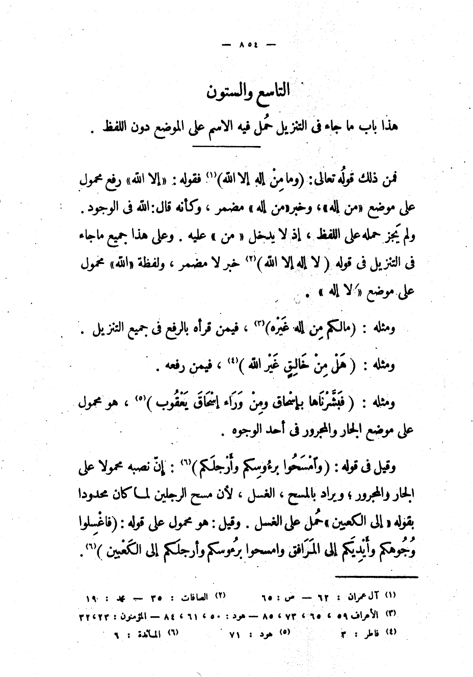هذا باب ما جاء في التنزيل حمل فيه الاسم على الموضع دون اللفظ فمن ذلك قوله تعالى: (وَما مِنْ إِلهٍ إِلَّا اللَّهُ) «1» فقوله: «إلا الله» رفع محمول على موضع «من إله» ، وخبر «من إله» مضمر، وكأنه قال: الله في الوجود.