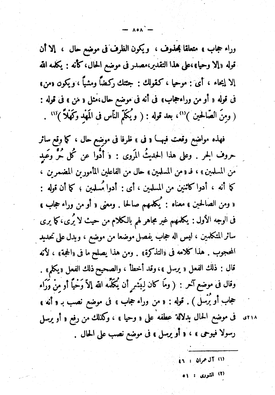 «ومن الصالحين» معناه: يكلمهم صالحا. ومعنى «أو من وراء حجاب» في الوجه الأول: يكلمهم غير مجاهر لهم بالكلام من حيث لا يرى، كما يرى سائر المتكلمين، ليس اله حجاب يفصل موضعا من موضع، ويدل على تحديد المحجوب. هذا كلامه في «التذكرة» . ومن هذا يصلح ما في «الحجة» ، لأنه قال: ذلك الفعل «يرسل» ، وقد أخطأ، والصحيح ذلك الفعل «يكلم» .