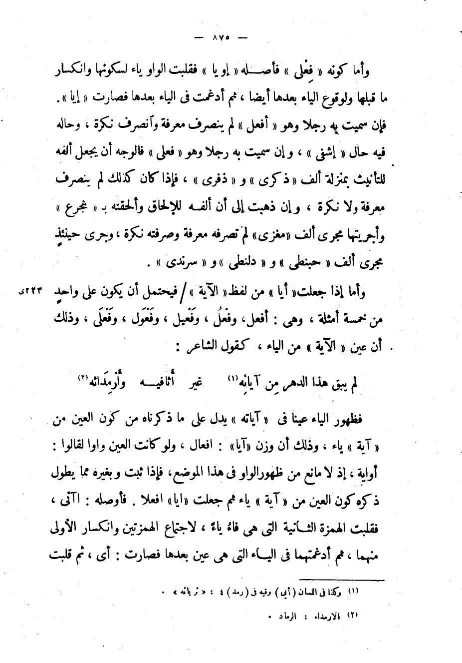أواية، إذ لا مانع من ظهور الواو في هذا الموضع، فإذا ثبت وبغيره مما يطول ذكره كون العين من «آية» ياء ثم جعلت «أيا» افعلا. فأوصله: إءيى، فقلبت الهمزة الثانية التي هي فاء ياءً، لاجتماع الهمزتين وانكسار الأولى منهما، ثم أدغمتهما في الياء التي هي عين بعدها فصارت: أي، ثم قلبت