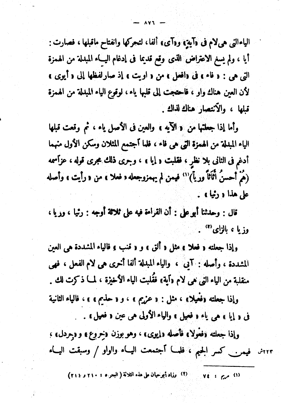 أيا، ولم يسغ الاعتراض الذي وقع قديما في إدغام الياء المبدلة من الهمزة التي هي: «فاء» في «افعل» من «اويت» إذ صار لفظها إلى «أيوى» لأن العين هناك واو، فاحتجت إلى قلبها ياء، لوقوع الياء المبدلة من الهمزة قبلها، والانتصار هناك لذاك.