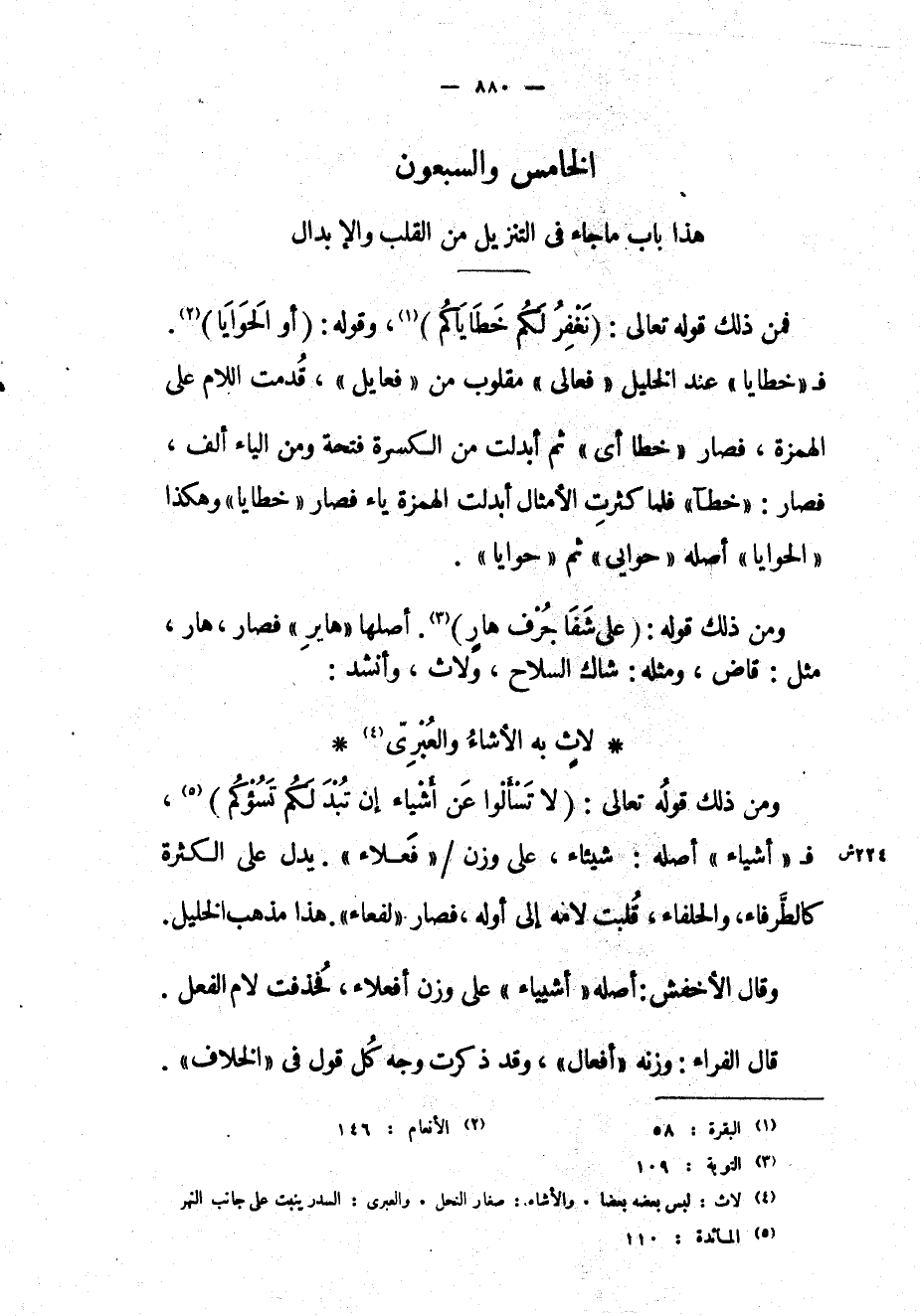 هذا باب ما جاء في التنزيل من القلب والإبدال فمن ذلك قوله تعالى: (نَغْفِرْ لَكُمْ خَطاياكُمْ) «1» ، وقوله: (أَوِ الْحَوايا) «2» .