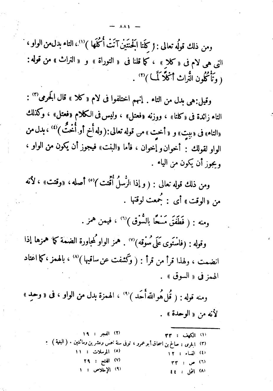 ومن ذلك قوله تعالى: (كِلْتَا الْجَنَّتَيْنِ آتَتْ أُكُلَها) «1» ، التاء بدل من الواو، التي هي لام في «كلا» ، كما قلنا في «التوراة» و «التراث» من قوله: