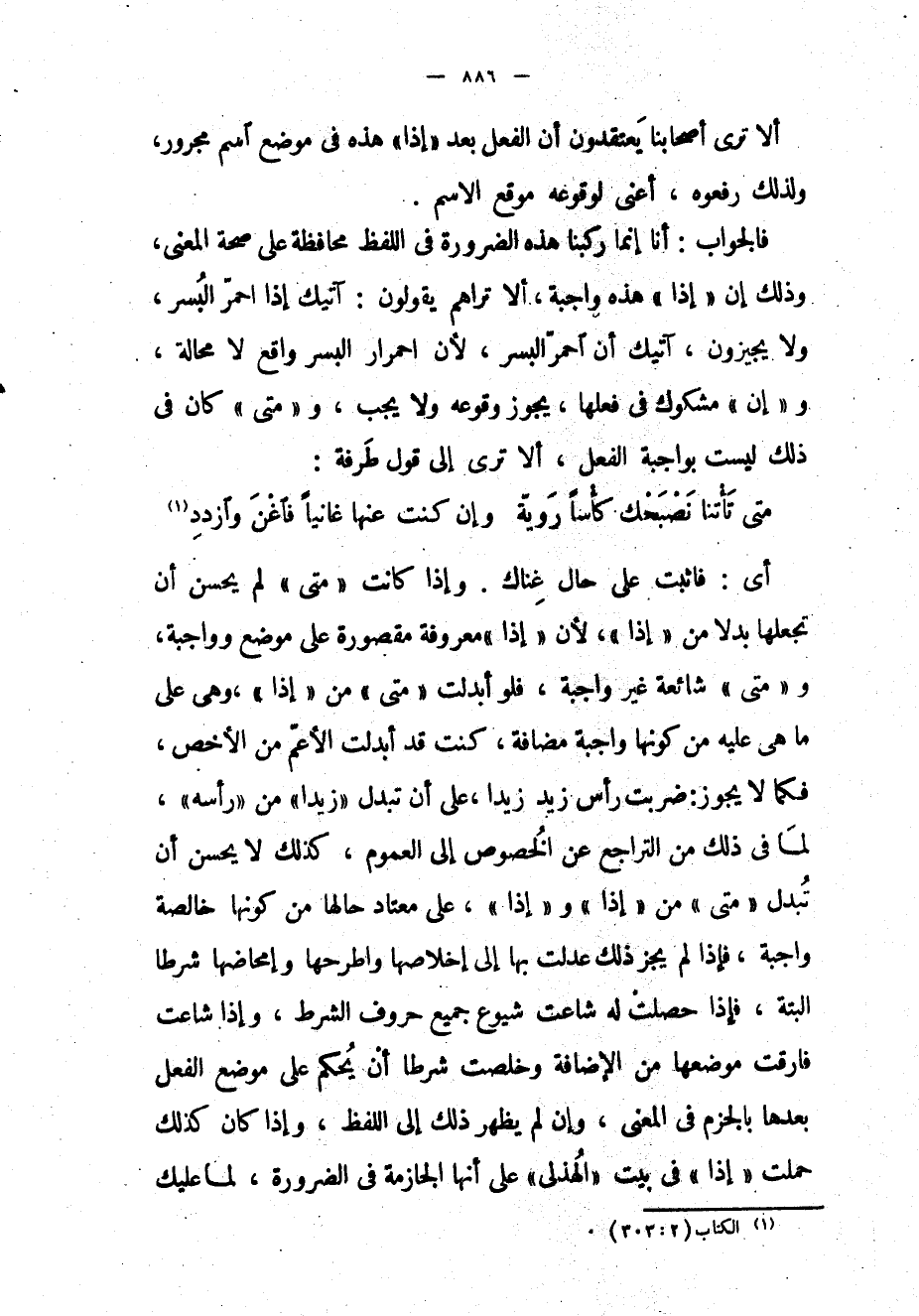 فالجواب: أنا إنما ركبنا هذه الضرورة في اللفظ محافظة على صحة المعنى، وذلك إن «إذا» هذه واجبة، ألا تراهم يقولون: آتيك إذا احمرّ البسر، ولا يجيزون، آتيك أن احمر البسر، لأن احمرار البسر واقع لا محالة، و «إن» مشكوك في فعلها، يجوز وقوعه ولا يجب، و «متى» كان في ذلك ليست بواجبة الفعل، ألا ترى إلى قول طرفة: