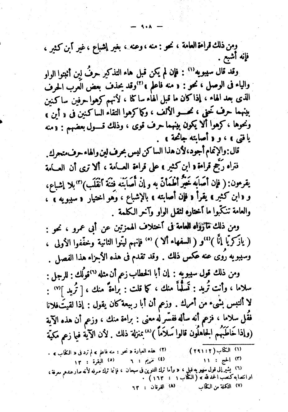 فتراه رجح قراءة «ابن كثير» على قراءة العامة، ألا ترى أن العامة يقرءون: (فَإِنْ أَصابَهُ خَيْرٌ اطْمَأَنَّ بِهِ وَإِنْ أَصابَتْهُ فِتْنَةٌ انْقَلَبَ) «3» بلا إشباع، و «ابن كثير» يقرأ «فإن أصابته» بالإشباع، وهو اختيار «سيبويه» ، والعامة تنكبوا ما اختاره لثقل الواو وآخر الكلمة.