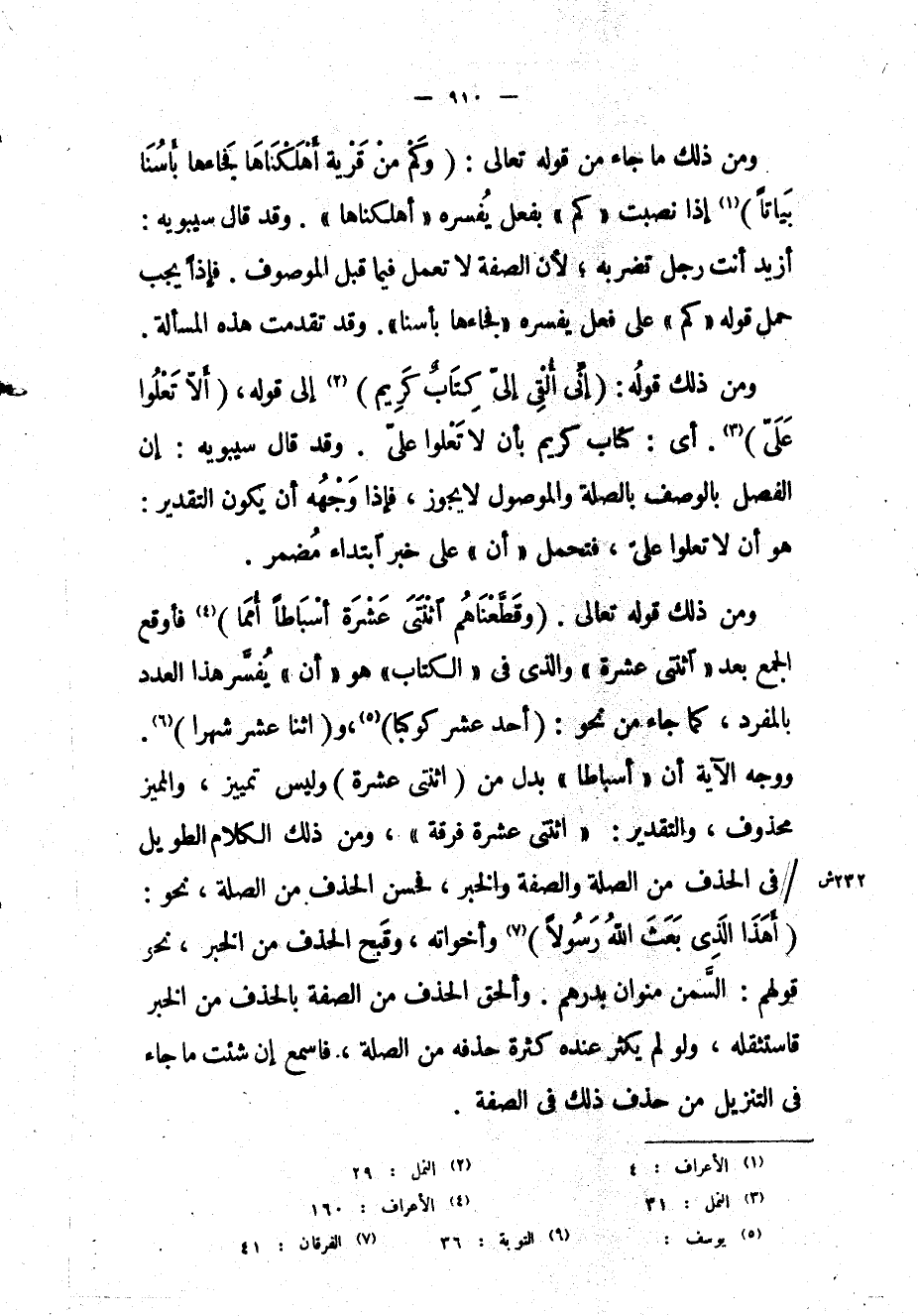 ومن ذلك ما جاء من قوله تعالى: (وَكَمْ مِنْ قَرْيَةٍ أَهْلَكْناها فَجاءَها بَأْسُنا بَياتاً) «1» إذا نصبت «كم» بفعل يفسره «أهلكناها» . وقد قال سيبويه: