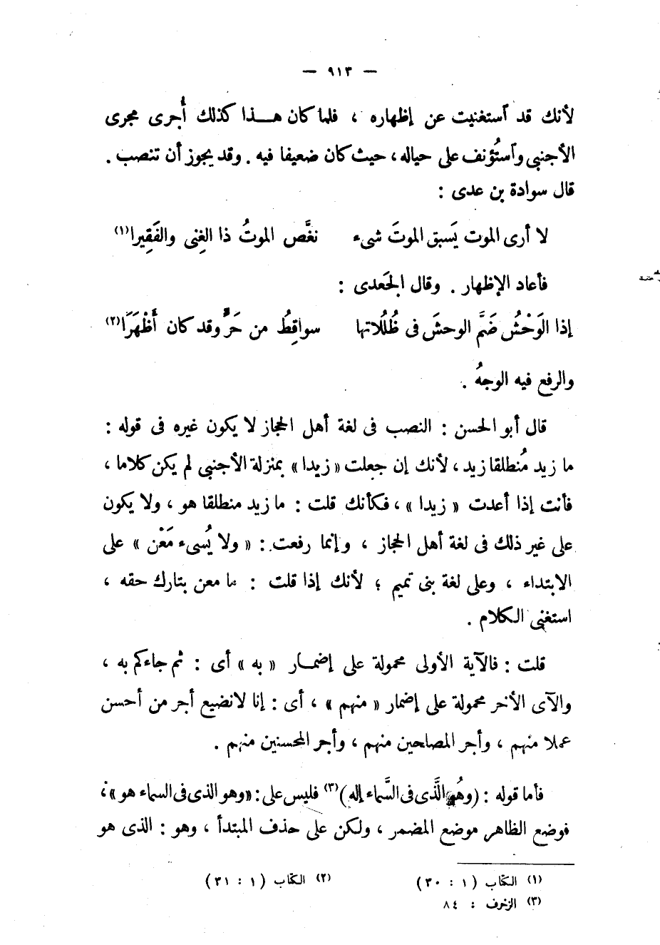 ما زيد منطلقا زيد، لأنك إن جعلت «زيدا» بمنزلة الأجنبي لم يكن كلاما، فأنت إذا أعدت «زيدا» ، فكأنك قلت: ما زيد منطلقا هو، ولا يكون على غير ذلك في لغة أهل الحجاز، وإنما رفعت: «ولا يسيء معن» على الإبتداء، وعلى لغة بني تميم لأنك إذا قلت: ما معن بتارك حقه، استغنى الكلام.