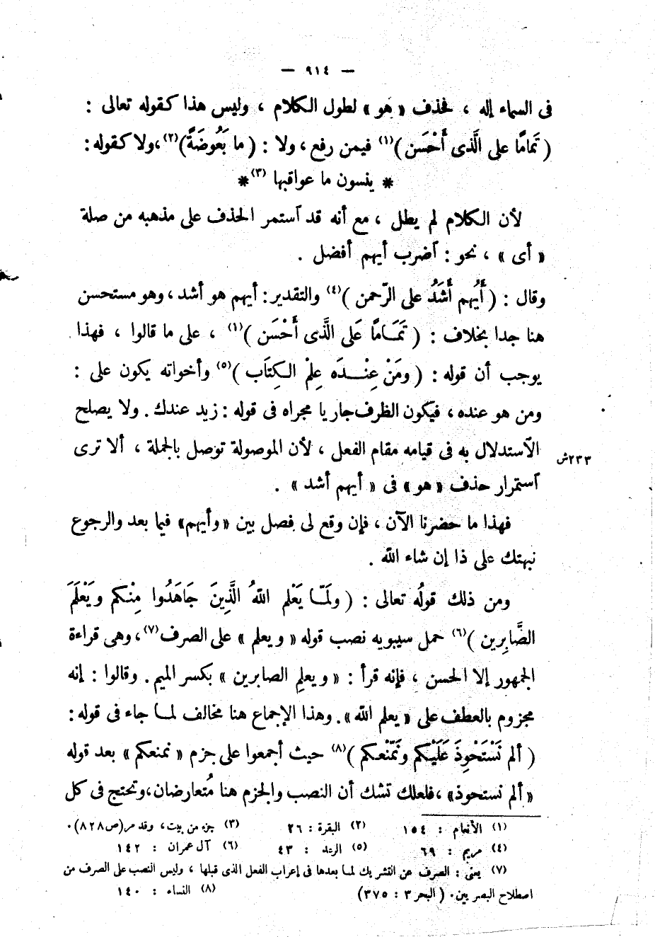 وقال: (أَيُّهُمْ أَشَدُّ عَلَى الرَّحْمنِ) «4» والتقدير: أيهم هو أشد، وهو مستحسن هنا جدا بخلاف: (تَماماً عَلَى الَّذِي أَحْسَنَ) «5» ، على ما قالوا، فهذا يوجب أن قوله: (وَمَنْ عِنْدَهُ عِلْمُ الْكِتابِ) «6» وأخواته يكون على: