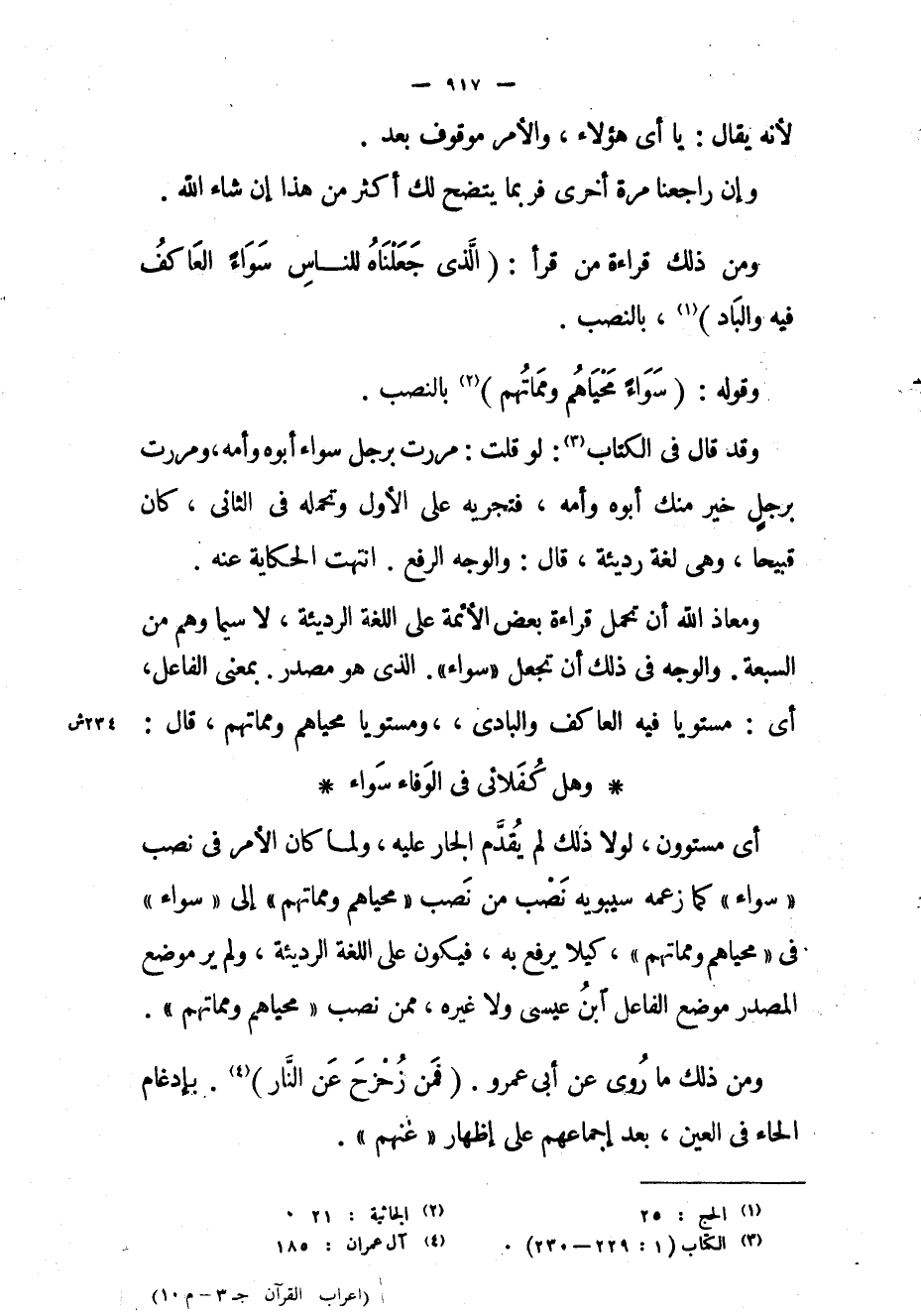 ومعاذ الله أن تحمل قراءة بعض الأئمة على اللغة الرديئة، لا سيما وهم من السبعة. والوجه في ذلك أن تجعل «سواء» . الذي هو مصدر. بمعنى الفاعل، أي: مستويا فيه العاكف والبادي، ومستويا محياهم ومماتهم، قال: