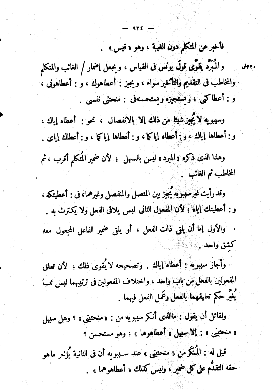 وقد رأيت غير سيبويه يجيز بين المتصل والمنفصل وغيرهما، فى: أعطيتكه، و: أعطيتك إياه لأن المفعول الثاني ليس يلاقي الفعل ولا يكترث به.