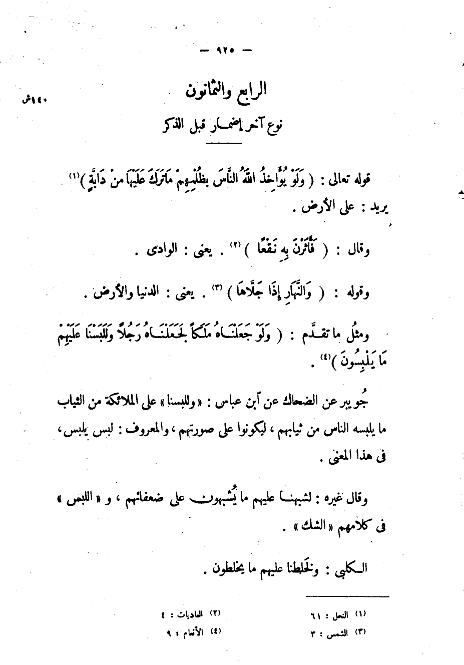 نوع آخر إضمار قبل الذكر قوله تعالى: (وَلَوْ يُؤاخِذُ اللَّهُ النَّاسَ بِظُلْمِهِمْ ما تَرَكَ عَلَيْها مِنْ دَابَّةٍ) «1» .